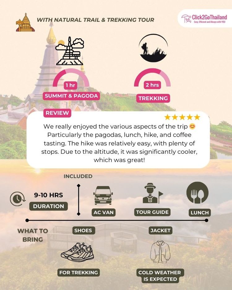 For Doi Inthanon with trekking tours, these are suitable for all skill levels, making them perfect for beginners and experienced hikers alike. Whether you're looking for a leisurely walk or a more adventurous hike, you'll enjoy exploring the stunning trails of Doi Inthanon National Park. Just make sure to wear comfortable shoes and gear up for an unforgettable day in nature!