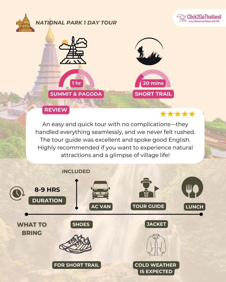 This tour lasts approximately 8-10 hours, including pick-up and drop-off, and is perfect for those who prefer less trekking while still enjoying the best of Doi Inthanon National Park. Highlights include visits to the iconic Chedis, breathtaking waterfalls, and a short nature trail to immerse yourself in the park’s serene beauty.
