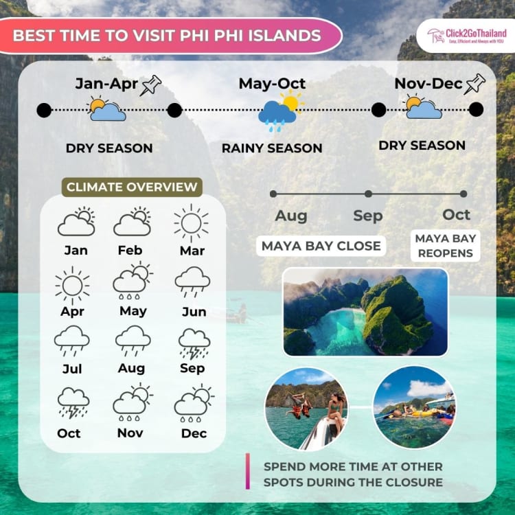 Phi Phi Islands are open to visitors year-round, allowing tourists to join a tour whenever it suits their schedule. However, weather conditions can vary throughout the year.
