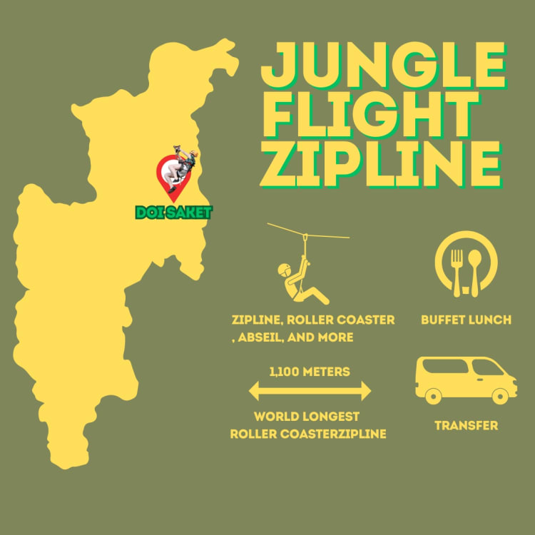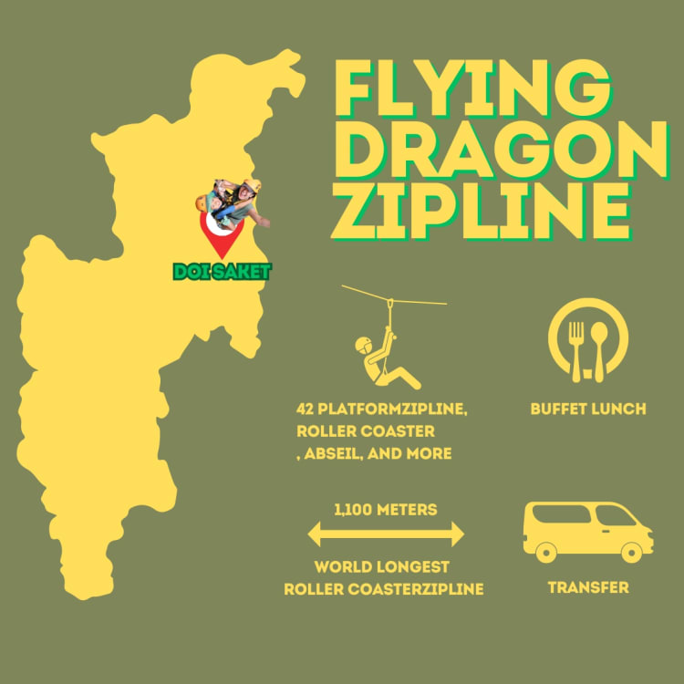 Soar through the lush Doi Saket rainforest mountains. Feel the adrenaline rush with a variety of treetop activities. Experience the excitement of a 1 km zipline and roller coaster. Flying Dragon offers an unforgettable adventure for everyone.